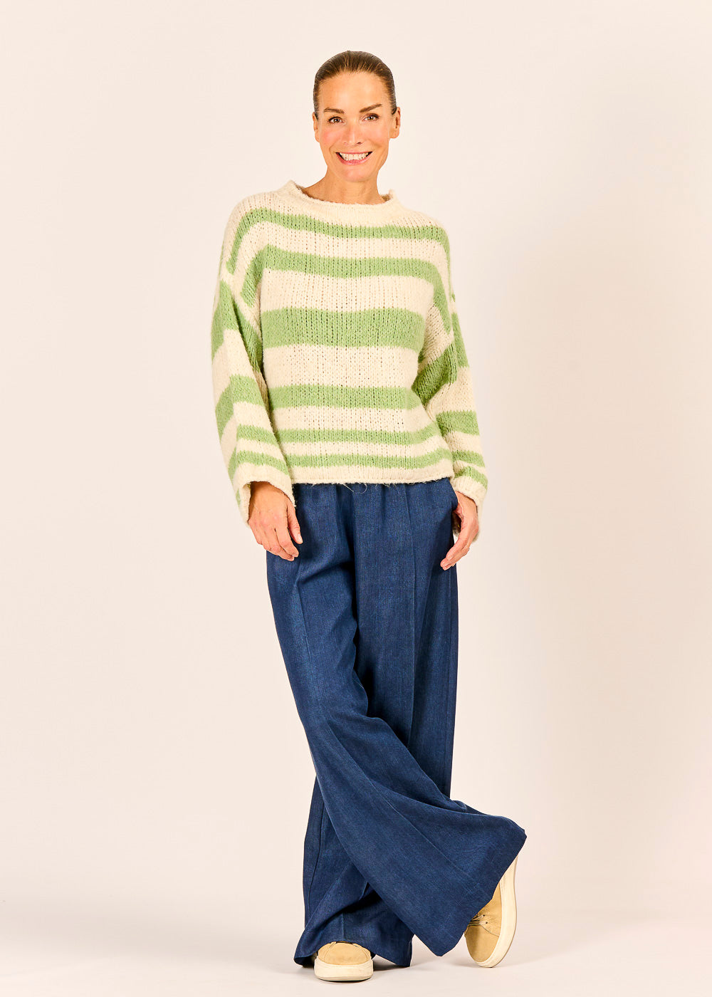 Dieser grob gestrickte Streifenpullover in einer fröhlichen Kombination aus sanftem Pastellgrün und hellem Creme ist ein kuscheliges Statement-Piece für die Übergangszeit. Das voluminöse Garn und der lockere Schnitt garantieren höchsten Tragekomfort und eine moderne, entspannte Silhouette. Er ist die perfekte Wahl, um schlichten Hosen wie dieser eleganten blauen Wide-Leg-Hose einen modischen Farbtupfer zu verleihen.