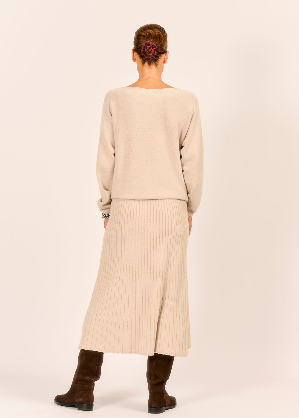 Der Rippenstrickrock in hellem Sandton strahlt schlichte Eleganz und natürliche Wärme aus. Seine feine Struktur betont sanft die Silhouette und sorgt für ein angenehmes Tragegefühl – perfekt für jeden Tag. Ein vielseitiges Basic, das sich mühelos von lässig bis elegant kombinieren lässt.